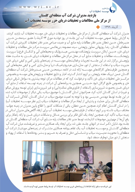 بازدید مدیران شرکت آب منطقهای گلستان از مرکز ملی مطالعات و تحقیقات دریای خزر موسسه تحقیقات آب ۱۳/بهمن/۱۳۹۹ ۱۳/بهمن/۱۳۹۹